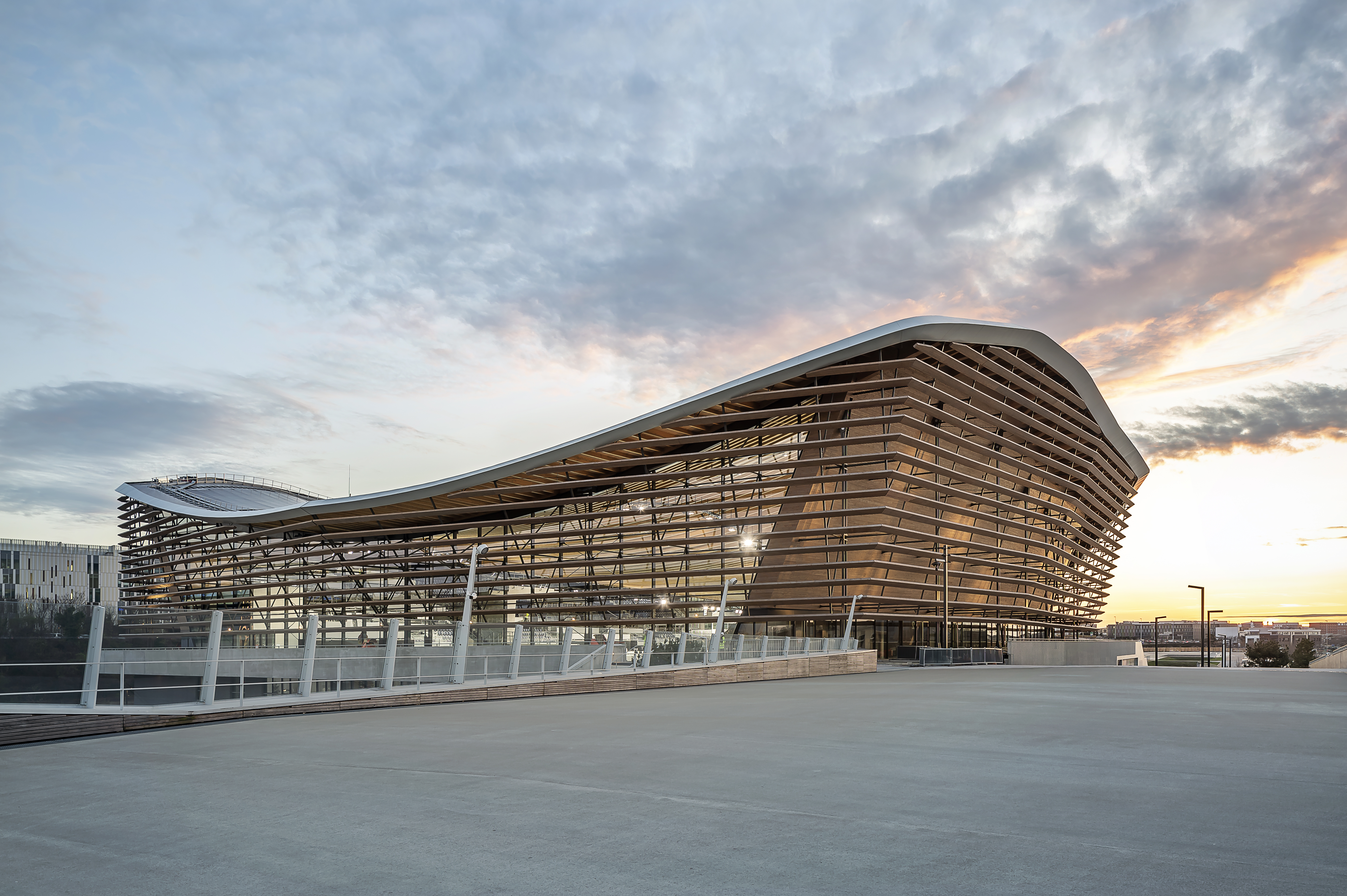 Using timber and bio-based building materials, the Aquatics Centre is a low-carbon building with a distinctive curved roof that is supported by the largest concave timber frame in the world – spanning 90m and using a framework consisting of 2,700m3 of wood.
